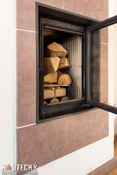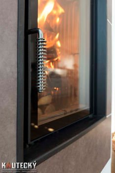 Radiátory v 2. NP pro efektivní vytápění ložnic a dalších prostor.Moderní keramická obestavba kamen: Použití velkoplošné keramiky dodává interiéru nadčasový a elegantní vzhled.